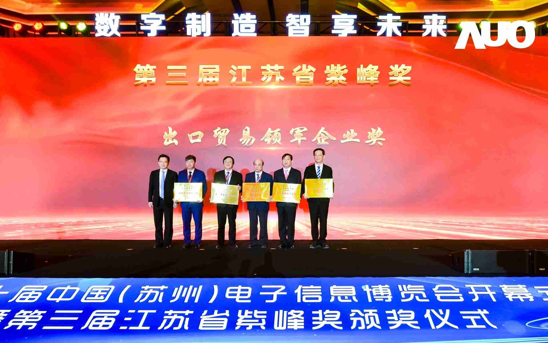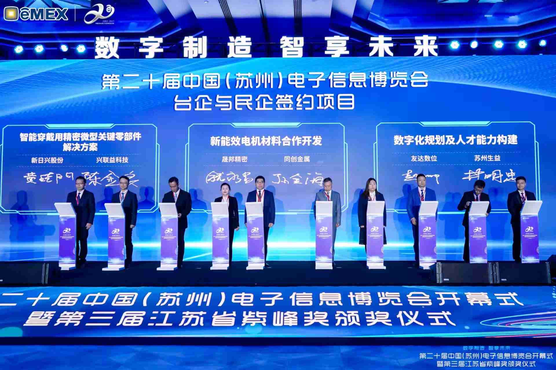 电博会开幕式当天也是第三届江苏省紫峰奖颁奖仪式,,省台办、、、、工信厅、、、商务厅、、、、苏州市相关领导均出席并颁奖。。。。该奖项为表彰对江苏高质量发展做出积极贡献的在苏企业,,,,由江苏省政府专门设立。。MG电玩光电 (苏州) 总经理郭振明代表上台领奖,,,,这也是MG电玩苏州连续三次蝉联紫峰奖 出口贸易领军企业奖。。。。MG电玩数位总经理赵丽娜女士,,也参与本次开幕式,,,,上台为本地化赋能签署战略合作协议,,,,将优质服务资源集合、、、、下沉到更多细分行业,,为更多地区的制造企业提供数字化转型服务。。