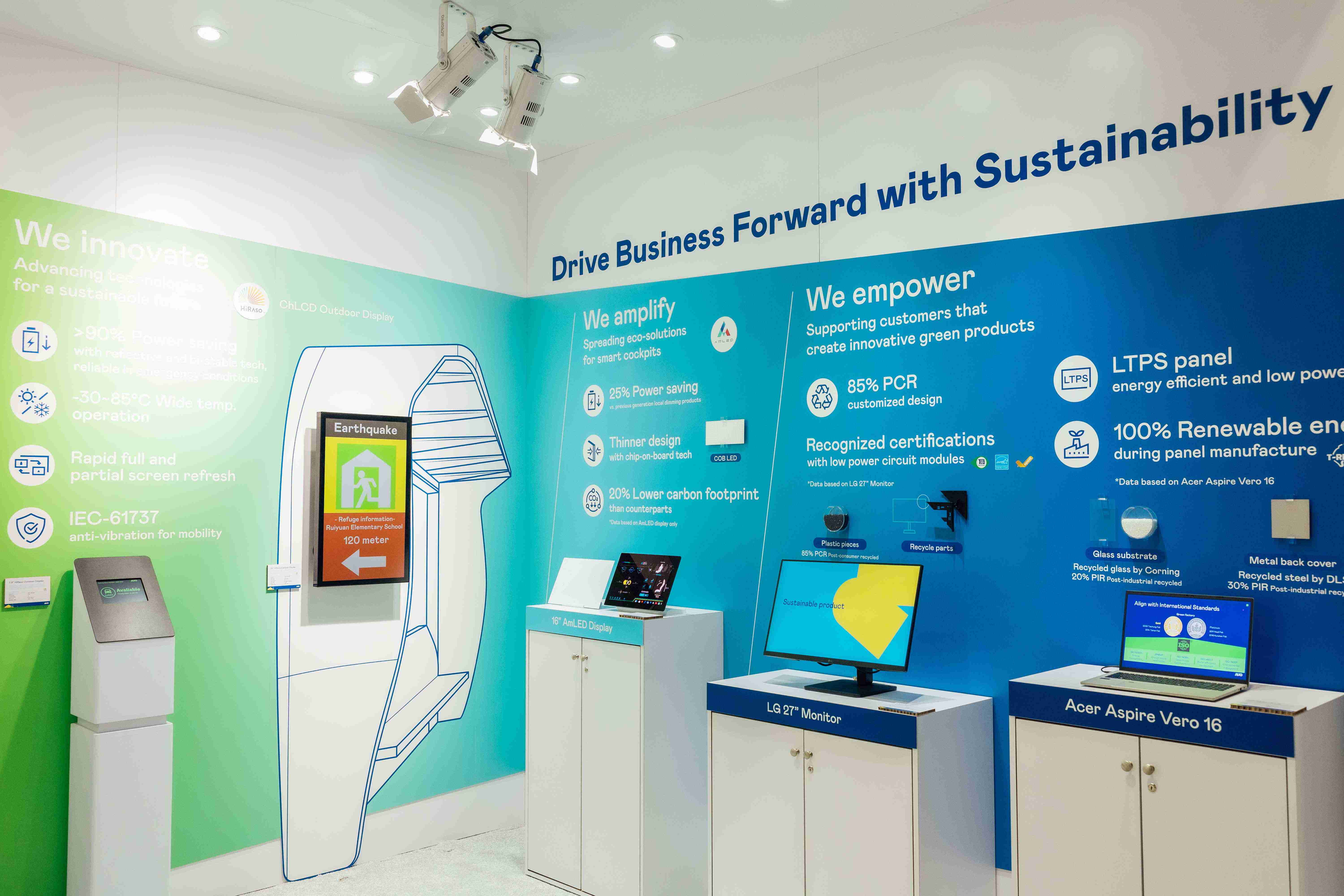 MG电玩运用创新显示技术HiRaso胆固醇液晶双稳态技术达到显示零耗能、、、扩大节能省电的AmLED显示技术应用于车用产品、、以再生的消费后回收(PCR)塑料及全绿电生产之面板,,应用于笔电及萤幕,,,增加绿色价值。。。。