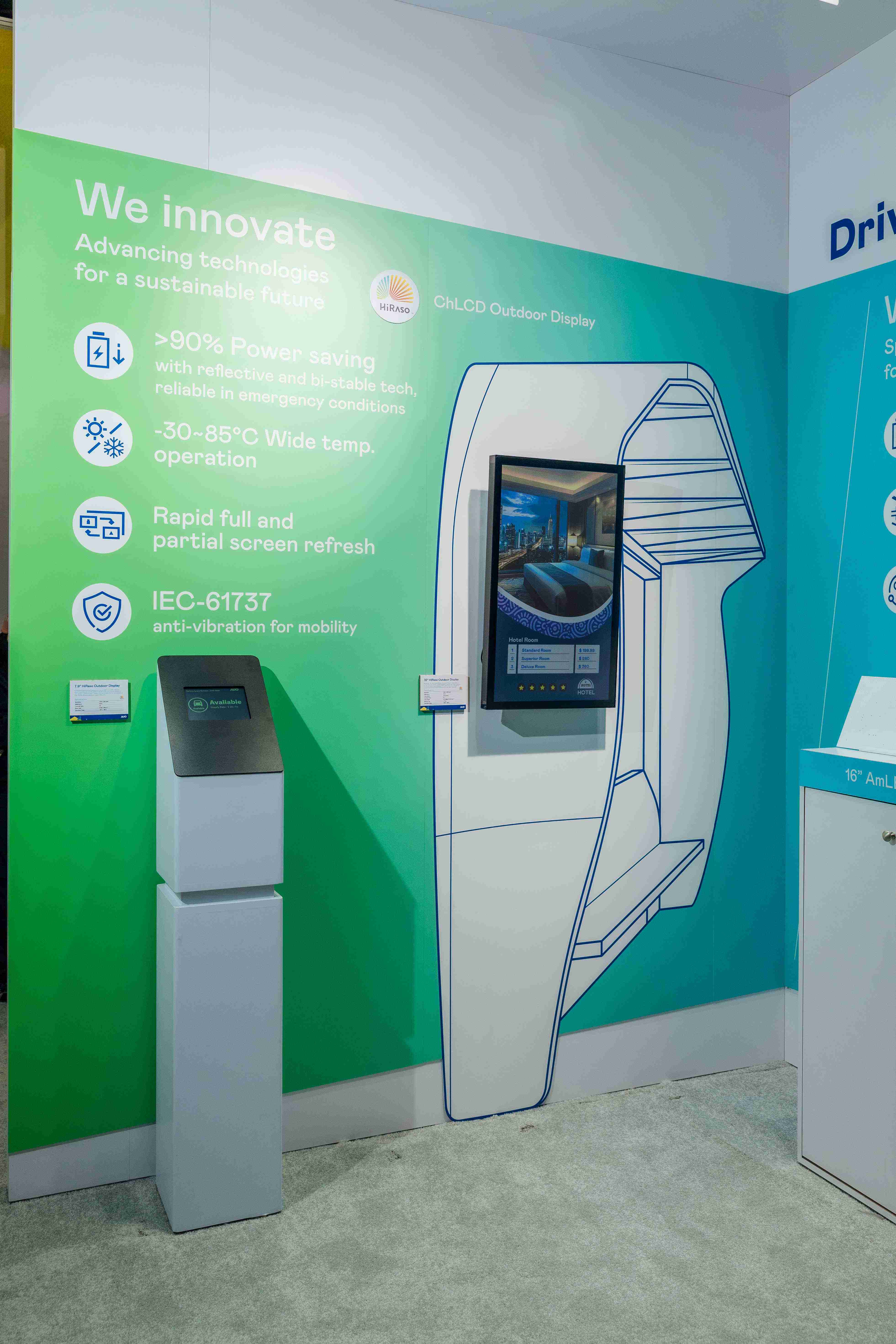 HiRaso胆固醇液晶显示器运用反射环境光线的方式,,,,呈现影像显示时零耗能的环保省电诉求,,,光线愈强愈能呈现绝佳的色彩饱和度及显示效果,,,同时在摄氏-30度至85度间宽温的使用优势,,,,为户外电子看板的新首选。。。。