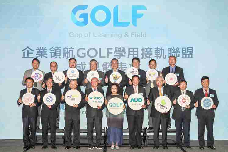 GOLF学用接轨联盟集结企业和学校的力量,,打造「学用合一、、、产学接轨」的创新合作平台 (前排左起:淡江大学副校长何启东、、、元智大学校长林启瑞、、、纬育执行长许延岳、、、、纬创总经理暨执行长黄柏漙、、、教育部政务次长范巽绿、、、、MG电玩董事长暨执行长彭双浪、、仁宝总经理暨执行长翁宗斌、、、、大同大学校长何明果、、、、圣约翰科大校长艾和昌;后排左起:明新科大校长林启瑞、、、、龙华科大校长葛自祥、、、、台湾科大校长廖庆荣、、、中兴大学副校长郑政峯、、、中央大学校长周景扬、、、台北科大副校长任贻均、、中华科大副校长石大明、、、明志科大校长刘祖华)