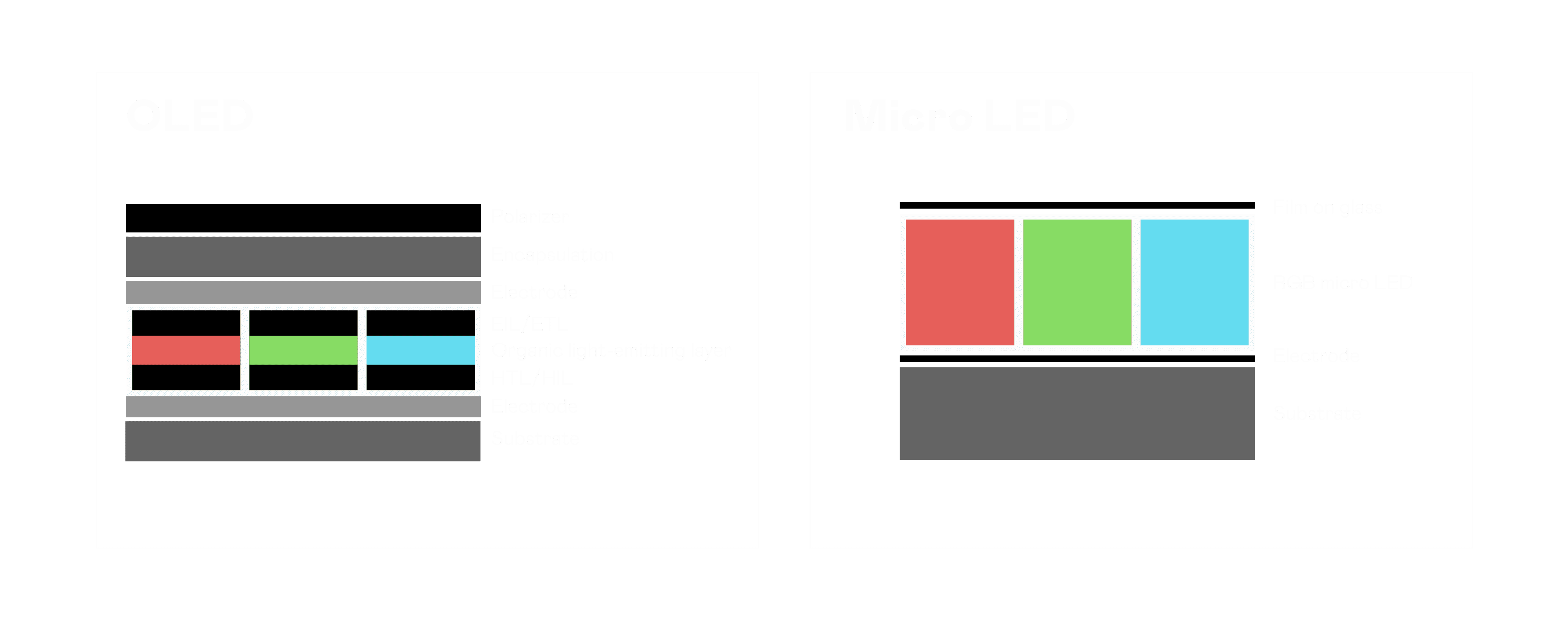 以 LED 做为显示画素,,,可让 LED 的发光效率发挥到极致,,从而让显示器具备优异的亮度表现,,不论是在户外或室内,,,,均具备出众的显示效果。。同时,,与使用有机材料的 OLED 相比,,,,LED 具备更稳定、、寿命更长的特性,,,,不仅不会有画面烙印问题,,而且更不容易出现故障、、坏点。。。
