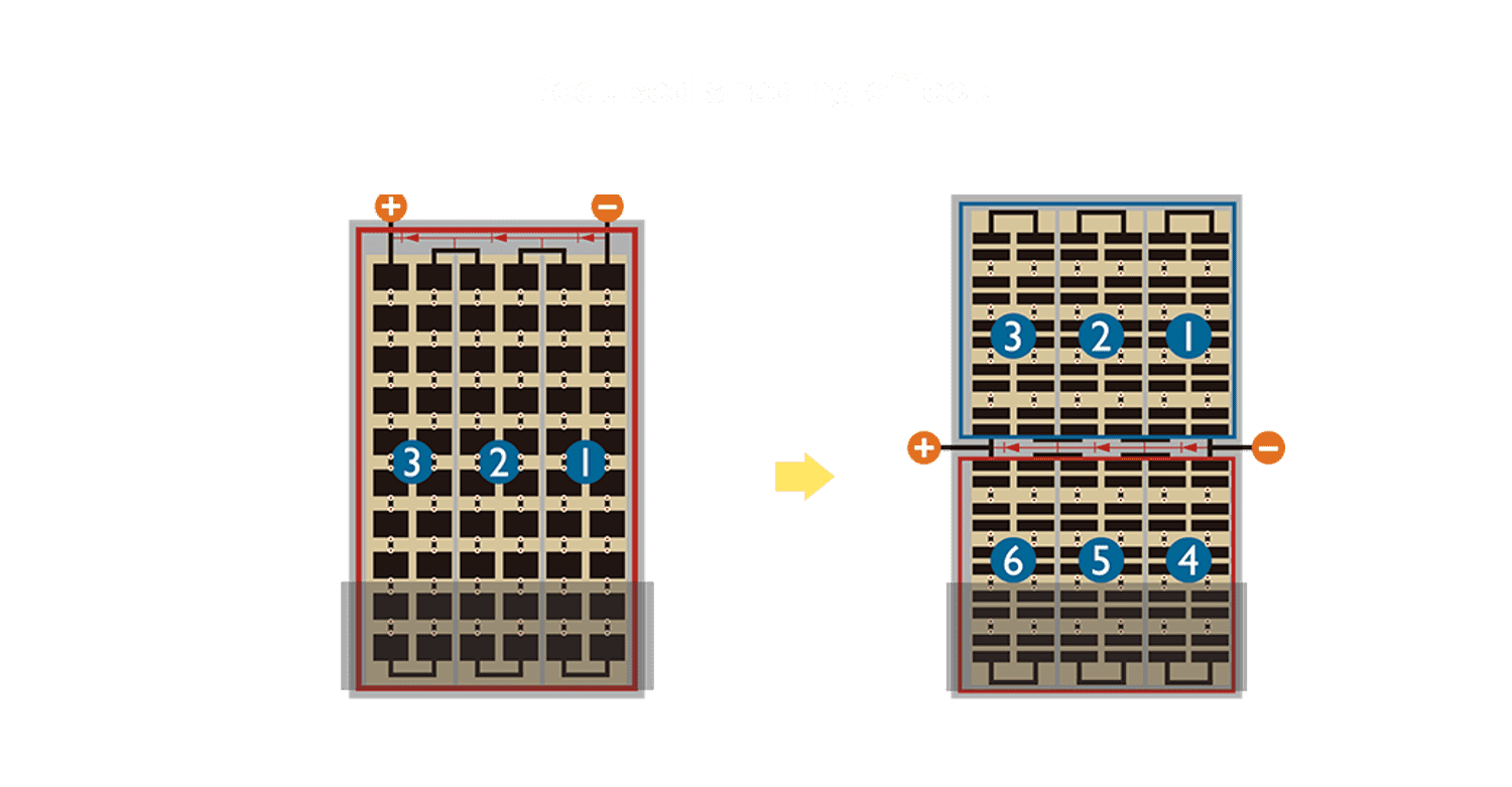 - 电池使用多条铜导线 (Copper wire) 于电池片上形成较短的电流路径,,提高电流收集效率,,采用圆形设计的铜导线较传统扁平式的铜焊带 (Ribbon),,,可增加入射至电池的光线量。。
